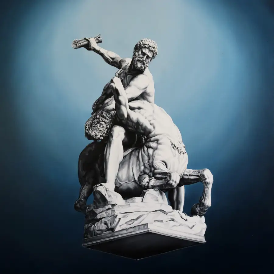 The Sculptures are meticulously chosen subject to their concepts, their mythology and their tableaux’s in order to sympathize with contemporary issues. The artist is challenging the positioning and placement of sculpture by translating them onto 2D surfaces lost in the empty stylised backgrounds and then placed in unfamiliar settings, such as the home. This makes these untouchable sculptures accessible to us, they are often out of reach, hidden away behind the thick concrete barriers of the museum walls. In today’s society it has been made more and more difficult to visit these sculptural masterpieces in the flesh especially with travel restrictions put in place due to the first pandemic of the 21st century.