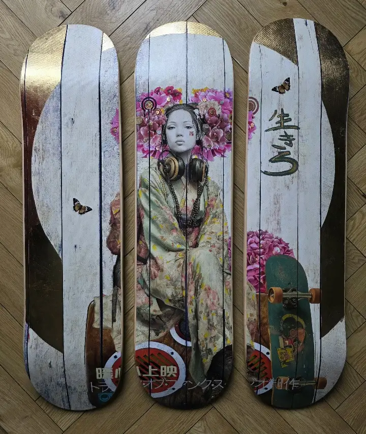 Skate Deck Trio. 3 x 7 Ply Premium ‘Venom’ Canadian Maple skate decks. Each deck is 21cm x 84cm. Total artwork is approximately 65cm x 84cm.