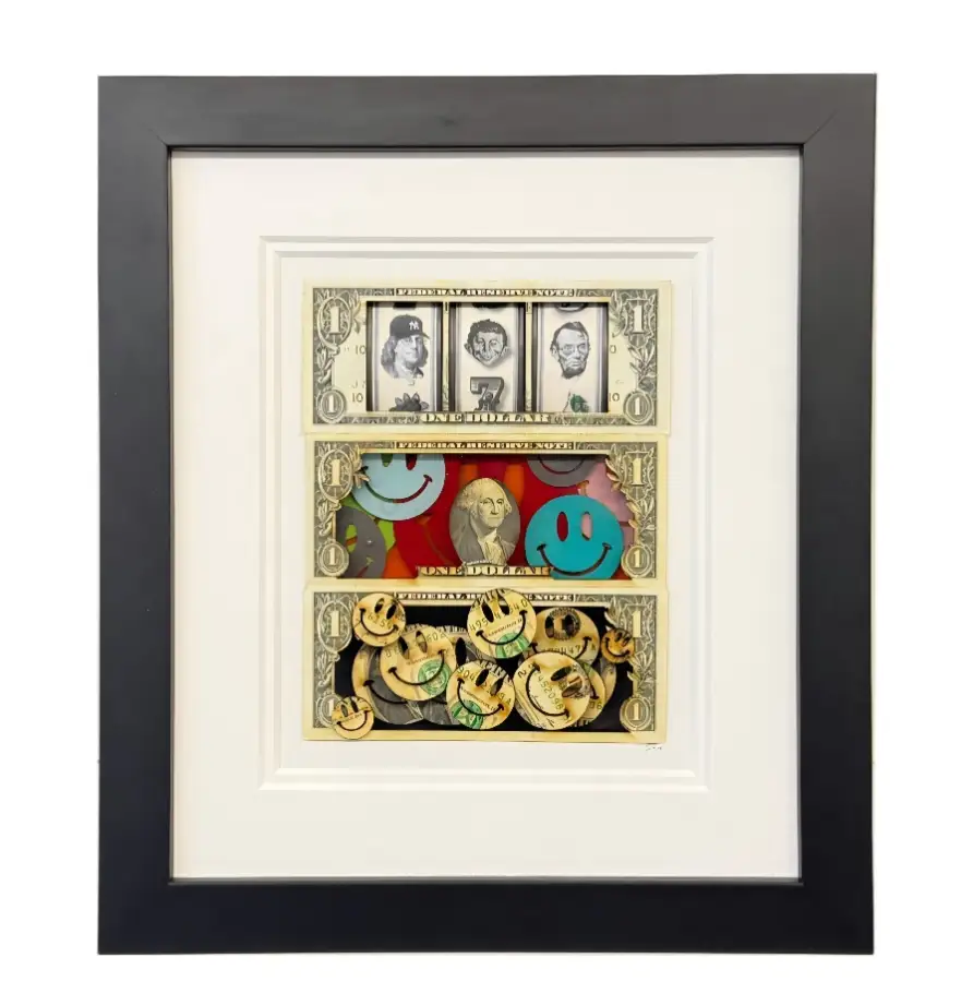 Spray can work, resin, collage, giclee, under genuine dollar notes.