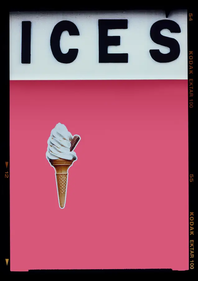 Created as an ode to Richard's childhood visits to his grandparents living on the Sussex coast, the artwork tells the story of the simple joys of the British seaside. The surreal twist of the iconic ice cream cone suspended on a colour block of Pink, has created a conceptual piece of art with bold graphic typographyGloss photographic c print from negative, hand made in the artists dark room.