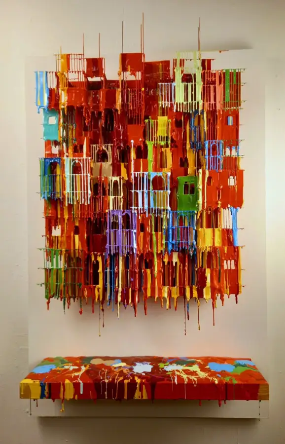 Russell West’s intensely coloured, dripping paint artworks draw the eye into a three-dimensional labyrinth of layers and hollows, colours and patterns