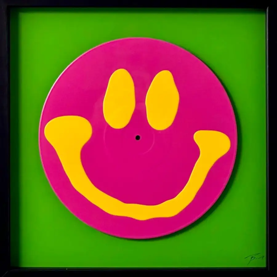 Funky pop art featuring an acid house smiley face on vinyl.