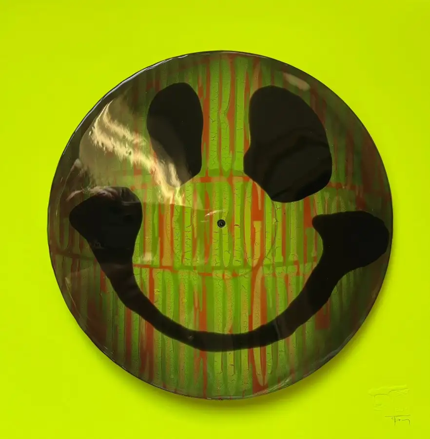 Original 12” albums with multi layered spray can work featuring iconic house lyrics. Layered resin finish to create a glass finish.