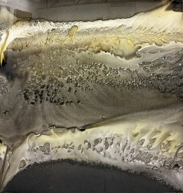 This piece is a must see in the flesh. Layers of water based paints immerse themselves into one another. Metallic surface allows light to bounce off casting prism. The sheer size of the painting is truly captivating.