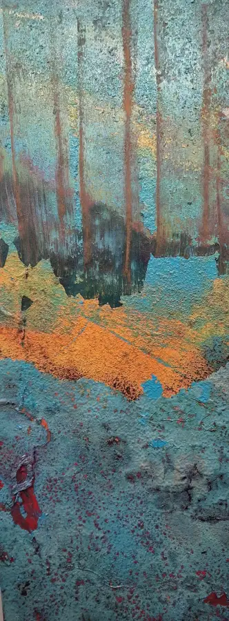 Sam Peacock has worked professionally as a painter since 2007, graduated from Coventry University in 1998 with a BA in Fine arts. Inspired by rural and coastal landscapes, Sam Peacock has challenged the traditional notion of landscape painting in every aspect of his work. Peacocks, unique interpretation of landscape painting involves the use of non-traditional oil base paints, varnishes, coffee grains and a variety of raw materials, all composed on a sheet of steel.