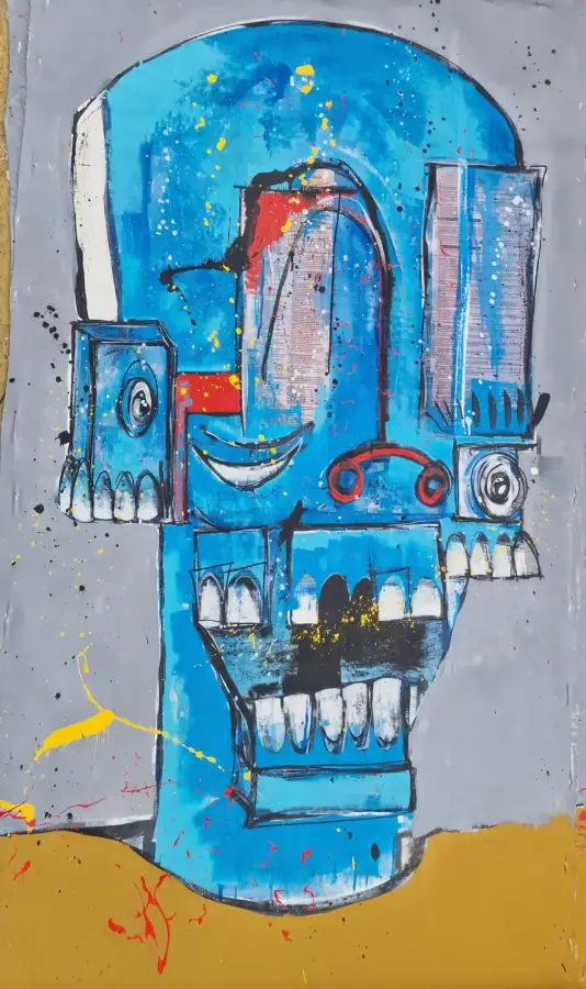 With a mixture of street, abstract and fine art influences, most of his work is created using a blend of acrylic, spray paint and charcoal. However, he doesn’t limit himself, sometimes it’s a case of using whatever’s at hand, a splash of tea, a mouthful of spit, on occasion he doesn’t even use a canvas. Art works have been painted on bed sheets due to the times he’s been too anxious to leave the house. Broken gates salvaged from wastelands next to filming locations have also found their way into the collection.