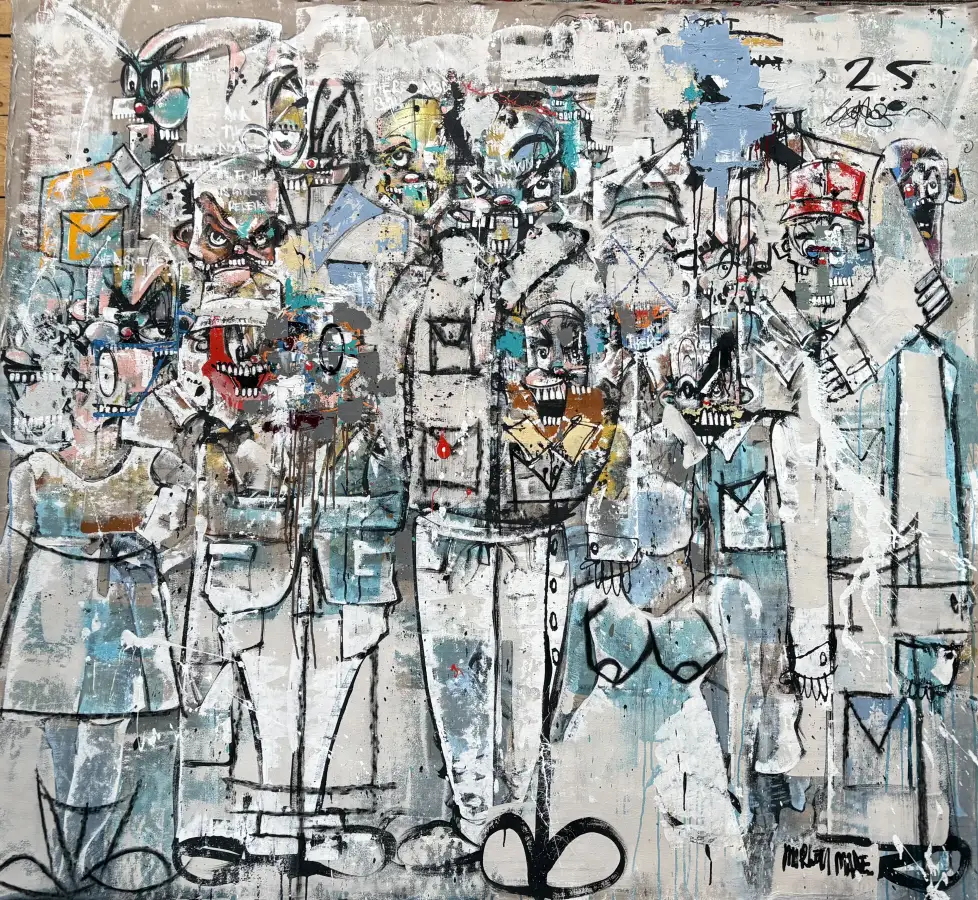 With a mixture of street, abstract and fine art influences, most of his work is created using a blend of acrylic, spray paint and charcoal. However, he doesn’t limit himself, sometimes it’s a case of using whatever’s at hand, a splash of tea, a mouthful of spit, on occasion he doesn’t even use a canvas. Art works have been painted on bed sheets due to the times he’s been too anxious to leave the house. Broken gates salvaged from wastelands next to filming locations have also found their way into the collection.